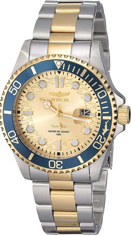 - Caja de acero inoxidable de 43 mm de diámetro x 12 mm de grosor; esfera dorada; ventana de fecha ampliada; manecillas e indicadores de hora luminosos