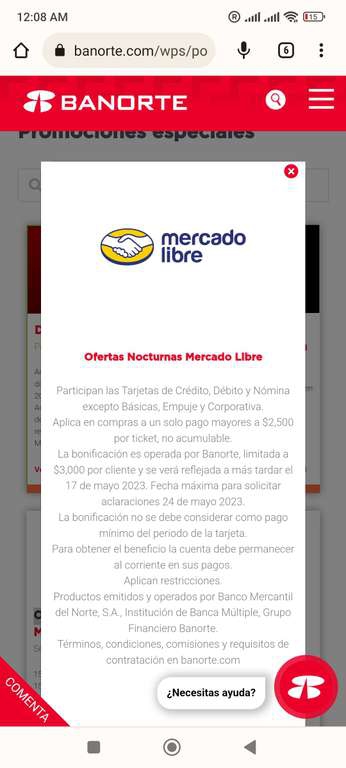 Banorte [Ofertas Nocturnas]: Bonificación del 15% (TDC Digital) o 10% con física en Mercado Libre (A un solo pago mayores a $2500)