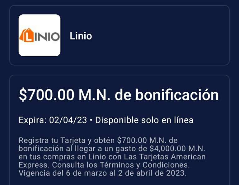 Al registrar y guardar la oferta en su Tarjeta, usted acepta los Términos de la Oferta. Oferta válida para compras realizadas en línea con Linio México (www.linio.com.mx/) y que hayan sido facturadas por Linio dentro de la vigencia de la promoción o la compra no será elegible para recibir la bonificación. Si American Express no recibe información que identifique su compra como elegible para la oferta, no recibirá el crédito de estado de cuenta. La oferta excluye la compra de tarjetas de regalo incluidas las electrónicas. Oferta válida solo en compras realizadas en línea. Las compras deben enviarse dentro de México para ser elegibles.