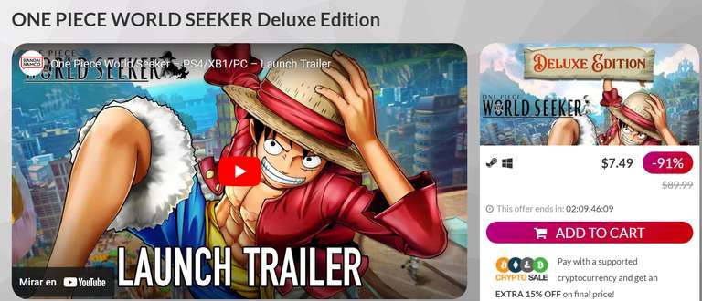 Indiegala Ir a la ofertaLa Edición Deluxe de ONE PIECE World Seeker incluye el juego y el Pase de episodios, que contiene 3 paquetes de episodios adicionales y elementos de bonificación.