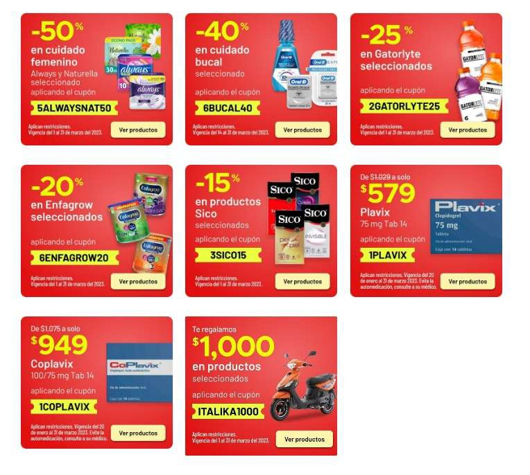 ¿Cómo puedo canjearlos?Da clic en el descuento que te interesa, e inmediatamente te redireccionará a la página donde se encuentra la lista de artículos en la que podrás canjear los cupones. Agrega a tu carrito los productos de tu elección.