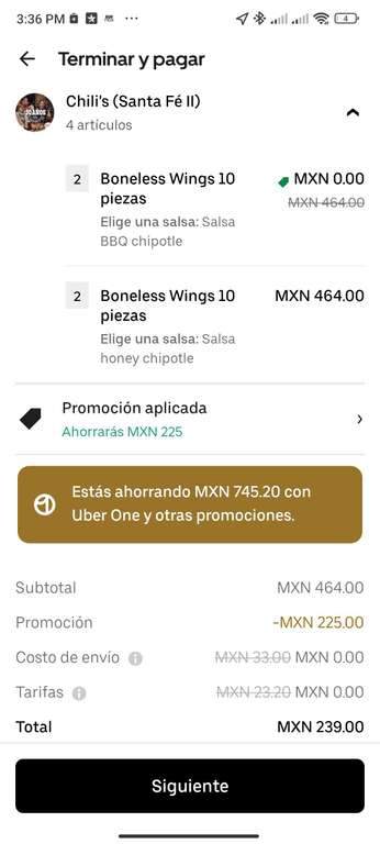 2x1 en Boneless en Chilis y con Uber-One te descuentan 225 pesos en la compra de $500