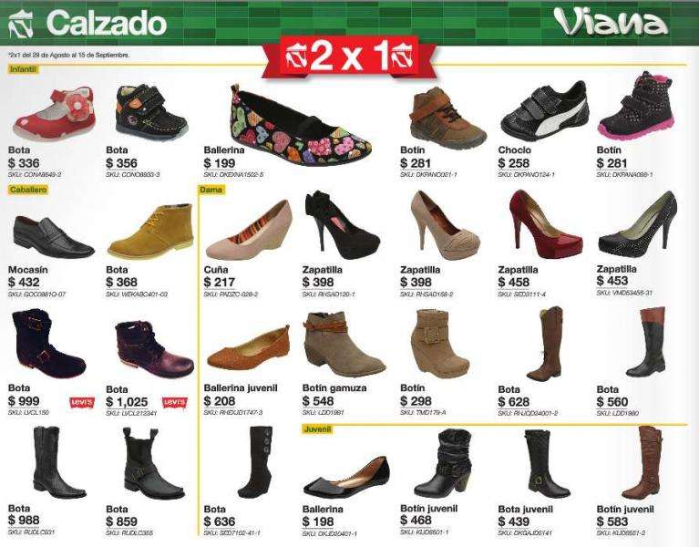 VianaLas tiendas Viana tienen una selección de zapatos al 2x1, que puedes ver en la imagen con el precio de cada par, esto vigente hasta el 30 de septiembre de 2014.