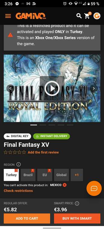 Gamivo Ir a la ofertaFinal Fantasy XV Royal Edition, otro juego que había estado cazando bajo de precio a $131 con cupón, yo tengo dos cuentas en Gamivo así que pude volver a usar el cupón en otra cuenta, está edición trae el juego base y todos los Dlcs. Eligen de vendedor a Battlekeys