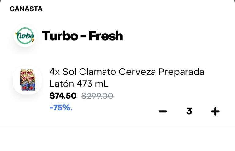RappiAparecían a buen precio 4 Sol Clamato en Turbo, pedí 3... 4x y 12 cervecitas a menos de 9 pesos cada una (ya con propina)