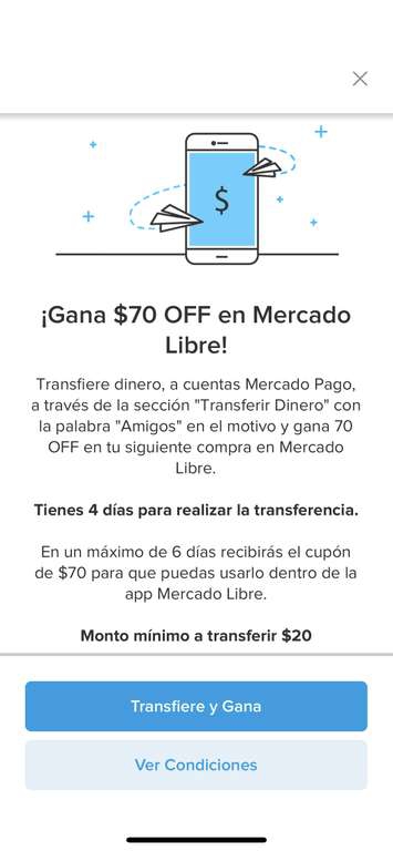 Ir a la ofertaMe llegó esta notificación: realizar una transferencia de al menos $20 con el motivo “Amigos”, a una cuenta Mercado Pago y en máximo 7 días, les va a llegar el cupón de descuento ($70) para Mercado Libre