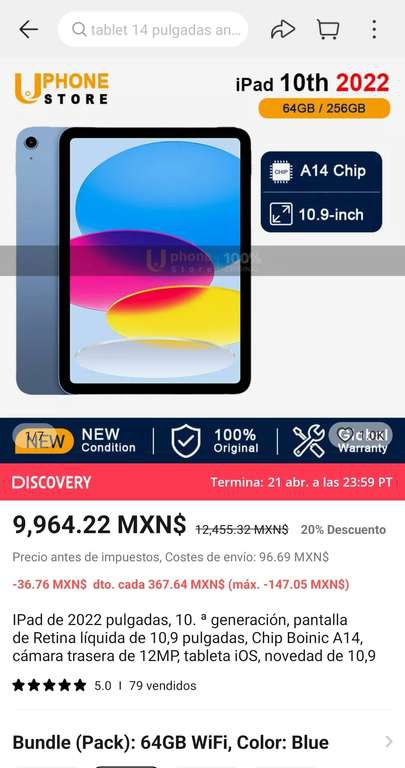 AliExpress Ir a la ofertaIPad 2022 10,9 pulgadas, décima generación pantalla de Retina líquida, Chip Bionic A14, cámara trasera de 12MP, tableta iOS, redes 4G 5G