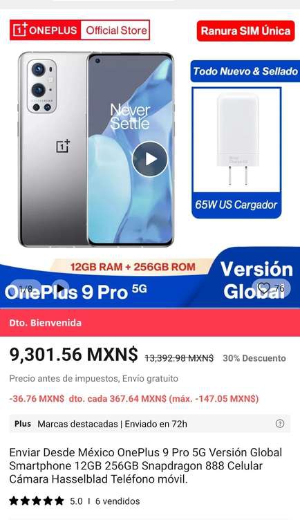 OnePlus 9 Pro 5G Versión Global, 12GB 256GB Snapdragon 888, Pantalla 6,7 Amoled, batería de 5000 mAh, Bluetooth 5,2 cámara de 32MP 48 MP, 120Hz, NFC y carga inalámbrica