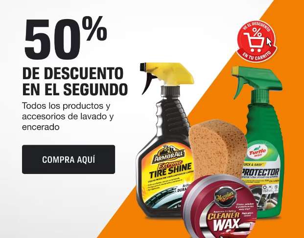 Aplica en productos, accesorios, pulidoras y aspiradoras de lavado y encerado iguales o combinados. El descuento aplica en el segundo producto y/o accesorio de Igual o menor precio que el comprado entre productos y accesorios. Promoción no acumulable. Marcas participantes: Armor All, Turtle Wax, Chemical Guys, Meguiar´s, ProElite, Black Magic, Blue Magic, Sonax, Rainx, Formula 1, 3M, Lucas, Oxyclean, Tanners Select, Stoner, Prestone, Mothers, Sholt, The Treatment, Smart y Gunk.