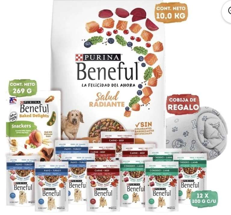 Bodega Aurrera Ir a la ofertaAlimento seco para perro Purina Beneful Bundle salud radiante salmon 10kg + 12 sobres beneful 100gr + 1 bolsa snack 269gr + 1 promocional