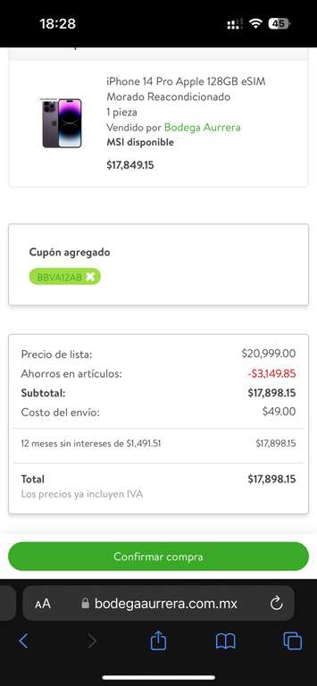 Bodega Aurrera Ir a la ofertaVendido y enviado por bodega Aurrerá. Se llega al precio con el cupón, bonificación inmediata del 15% con TDC BBVA.