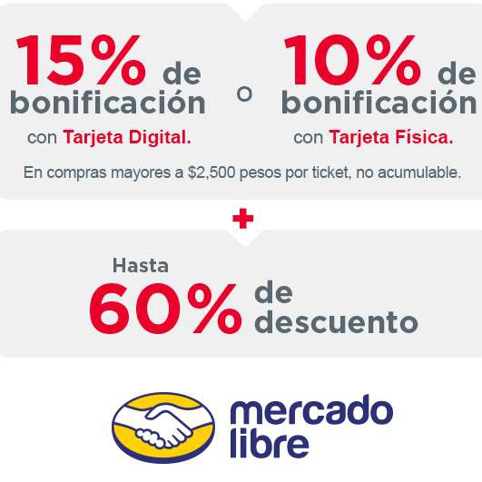 Banorte Ir a la ofertaEste 15 de abril podrás obtener hasta un 15% de bonificación pagando con tarjeta digital Banorte y 10% pagando con tarjeta física en Mercado LIbre. Válido con tarjeta de crédito, débito y nómina Banorte, compra mínima $2,500, máximo de bonificación $3,000.