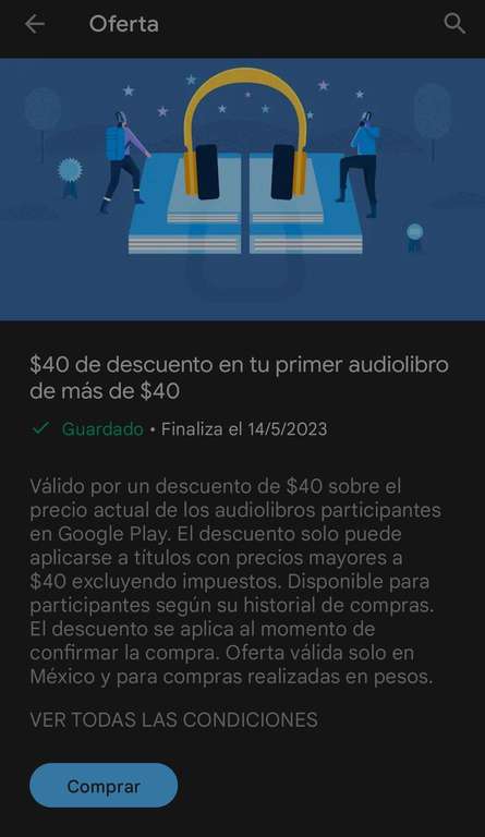 Google Play Ir a la oferta />Dan click y podrán canjearlo, ojo debe ser primera compra en audio libros.