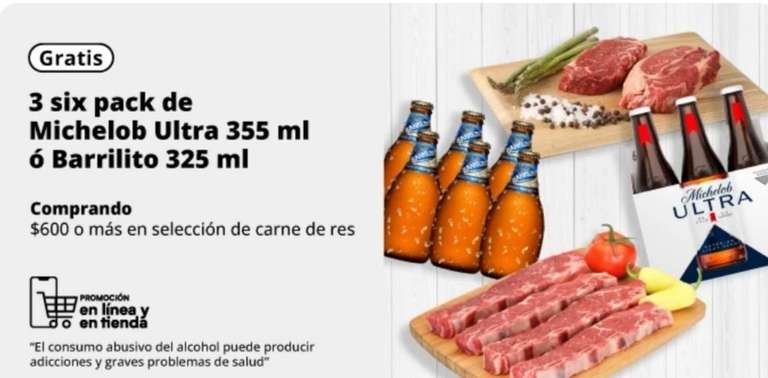 HEB Ir a la ofertaCompra 600 Pesos Carne Seleccionada y Gratis 3 Six Michelob Seleccionados - Por cada $600 pesos de compra te regala 3 Six Michelob o 3 Six Barrilito.