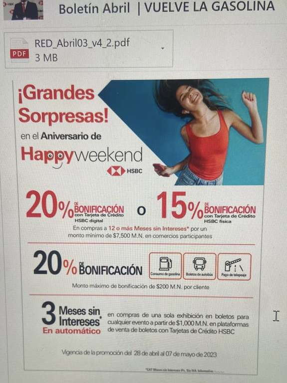 HSBC Happy Weekend 20% de descuento en gasolina (máx. $200) | 20% de bonificación con TDC Digital a 12 MSI (compra mínima de $7500) y más