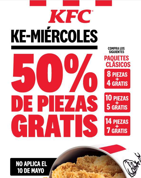 KFCVálido los días miércoles del 12 de abril al 24 de mayo 2023, excepto el miércoles 10 de mayo de 2023. No aplica con otras promociones o descuentos. Solo en receta Crujipollo®. Cambio de receta con costo adicional. Sujeto a disponibilidad. Imágenes de carácter ilustrativo.