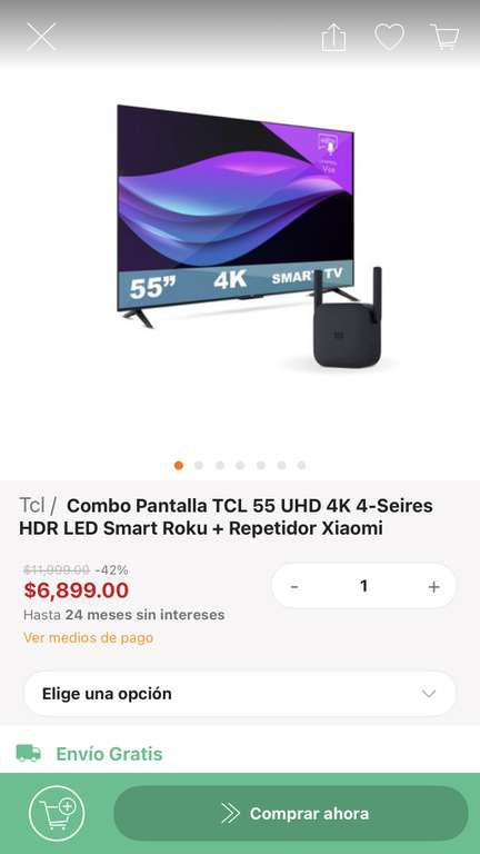 Linio | Pantalla TCL 55” UHD 4K ROKU + repetidor Xiaomi ($6,199 AMEX)