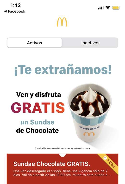 McDonald'sAbre tu app dd McDonals y obtendras un sundae de chocolate totalemente gratis! el cupon al momento de abrir el app tiene vigencia de 7 dias apartir de la descarga solo un cupon por cliente (o por app) sin minimo de compra Valido en todos los restaurantes excepto algunos estados del pais checar terminos y condiciones