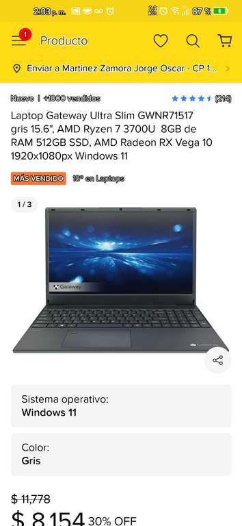 Mercado Libre: Laptop Gateway 15.6 Ryzen 7 3k 8Gb Ram SSD