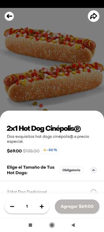 Rappi Prime: Cinépolis 2 Hot Dogs por 69$ (+ tarifa de servicio)