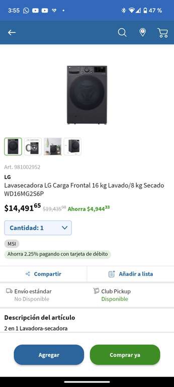 Sam's Club Ir a la ofertaLavasecadora LG 16kg, llevo tiempo buscado una colo la ven vale la pena? No tengo membresía en Sams no se si animarme a sacarla para comprarla