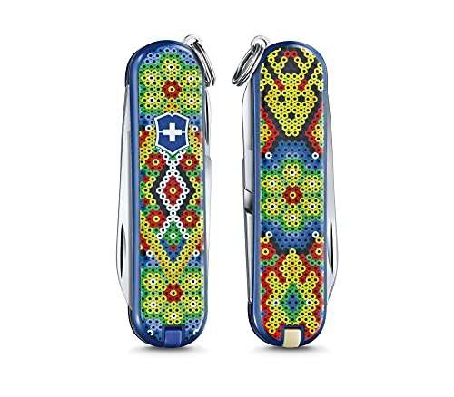Es la clásica navaja Victorinox para llevar en el llavero o bolsillo con 7 usos pero es versión limitada de arte huichol y de alebrije en honor a México. En el catálogo oficial está en 850 y en casi todos lados.