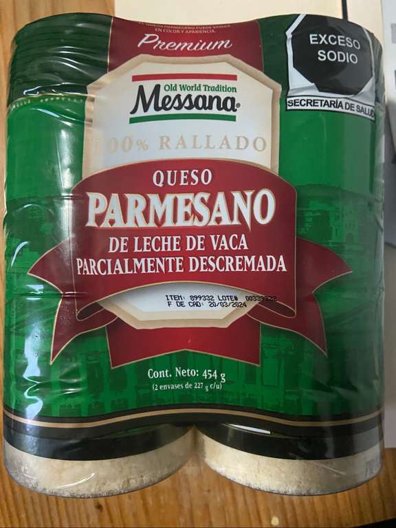 CostcoVi en Costco Coapa 2 botes de queso parmesano Messana cada uno de 227gr x $99 ($102 si pagas con TDC) . En total te llevas 545 gr por un queso bueno y cumplidor. Ojalá lo encuentren en otras sucursales
