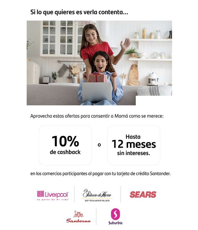 SantanderOtra promoción bancaria por el día de las madres. Ahora Santander bonificará el 10% de las compras en Liverpool, Palacio de Hierro, Suburbia, Sears y Sanborns. Aplica en compras arriba de $3,000 a un solo pago con tarjeta de crédito.