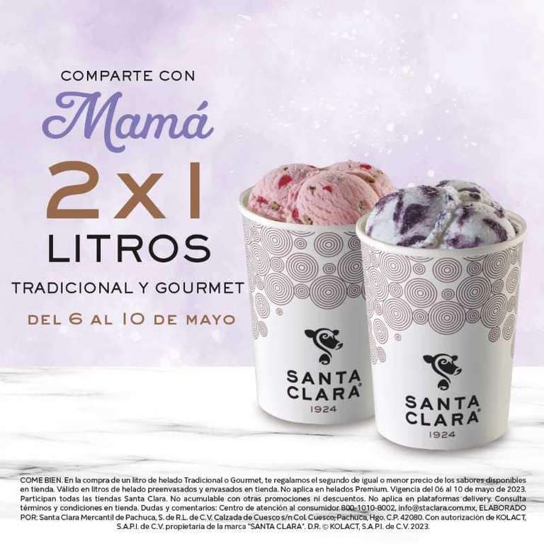 Helados de Santa Clara Día de las Madres 2 por 1 en Litros de Helado Tradicional y Gourmet (6 al 10 de mayo)
