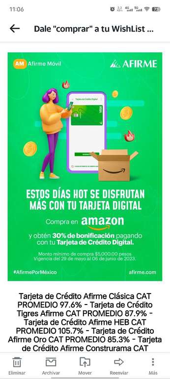 Ir a la ofertaMe llegó un correo electrónico del banco afirme notificando que básicamente te bonifica el 30% en compras mayores a $5000 en Amazon y se me hizo una promoción súper padre si compras un producto en Amazon y que te llega a costar un poco más de 5000 pesos tienes un 30% de bonificación sobre el total pagando con tu tarjeta digital en el estado de cuenta de tu tarjeta de crédito