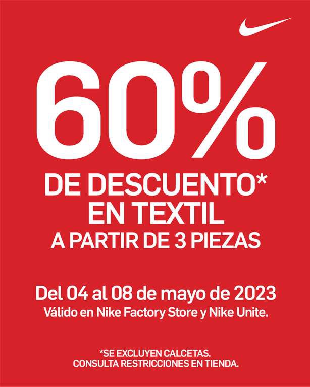 Nike 60% de descuento en ropa y 40% de descuento en tenis Nike