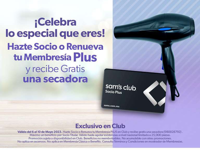Hazte Socio o Renueva tu Membresía PLUS en Club y recibe gratis una secadora (980028792). Máximo un beneficio por Socio Titular. Válido hasta agotar existencias a nivel nacional limitado a 25,000 piezas. Promoción sujeta a disponibilidad en Club. Beneficios no reembolsables. No acumulable con otras promociones. No aplica en ascensos. No aplica en Membresía Clásica o Benefits. Consulta Términos y Condiciones en mostrador de Membresías.