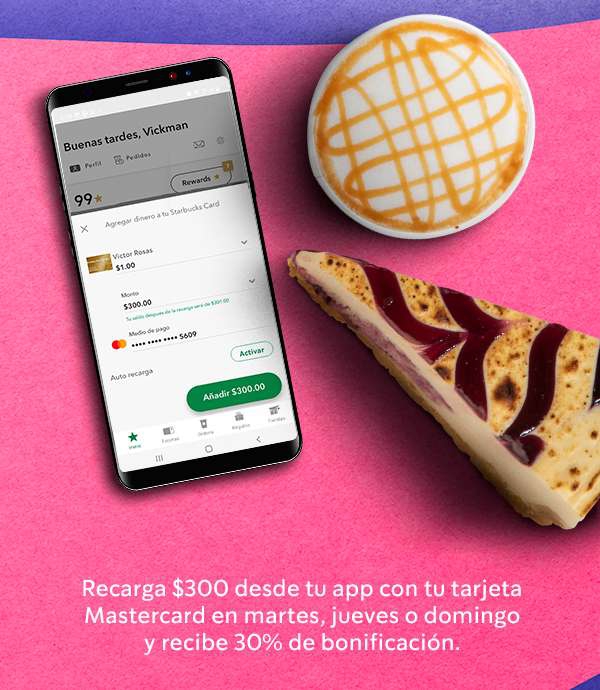 - Realiza una recarga de $300.00 los días martes, jueves y domingos en la aplicación Starbucks Rewards con tu tarjeta de crédito y/o débito MASTERCARD y recibe un abono de $90 pesos en tu saldo en la app. Válido para Tarjetahabientes Titulares y adicionales. Vigencia del 8 al 28 de mayo de 2023 y/o hasta agotar 2,222 redenciones. Sin límite de promociones por tarjetahabiente y por día.