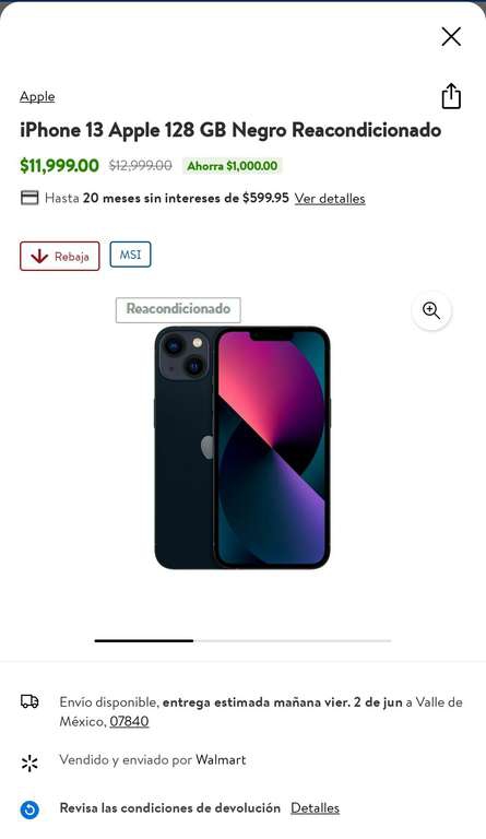 Walmart Ir a la ofertaiPhone 13 128gb reacondicionado vendido y enviado por Walmart. Tiene un descuento de 1000$ y llega a $10,250 con promoción 15% BBVA y envío incluído.