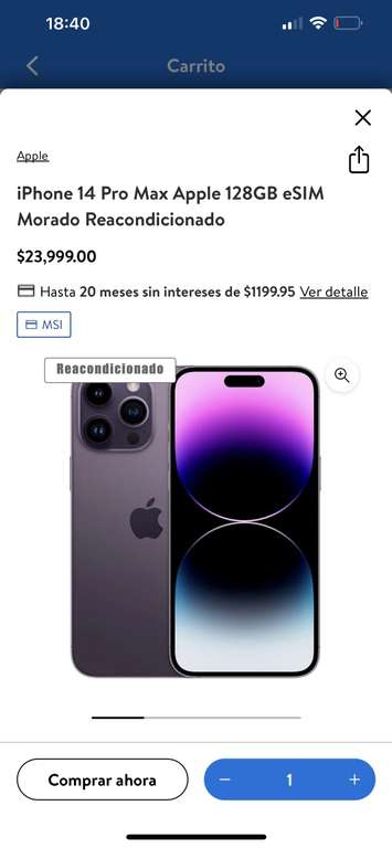 Walmart iPhone 14 pro Max 128gb esim morado reacondicionado Walmart 12 MSI con BBVA