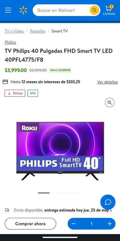 Walmart Television Philips 40 Inch FHD Smart TV LED 40PFL4775/F8