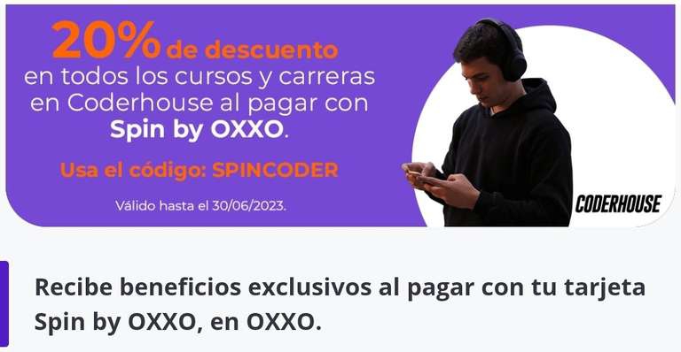 20% de descuento en cursos y carreras CODERHOUSE; al pagar con spin by oxxo.