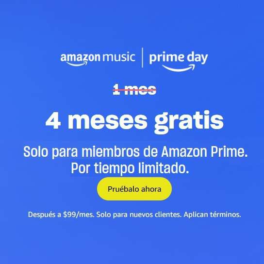 Amazon Ir a la ofertaPromoción Prime Day, 4 meses gratis de Amazon Music Unlimited para usuarios nuevos y tal vez para usuarios sin suscripción activa.