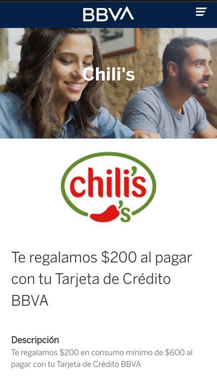 Chili's Ir a la ofertaTe regalamos $200 en consumo mínimo de $600 al pagar con tu Tarjeta de Crédito BBVA