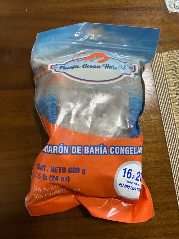 Bolsa de 680g en 97 pesos. Comprado en sucursal Villahermosa, están escondidos detrás de otras cajas de camarones.