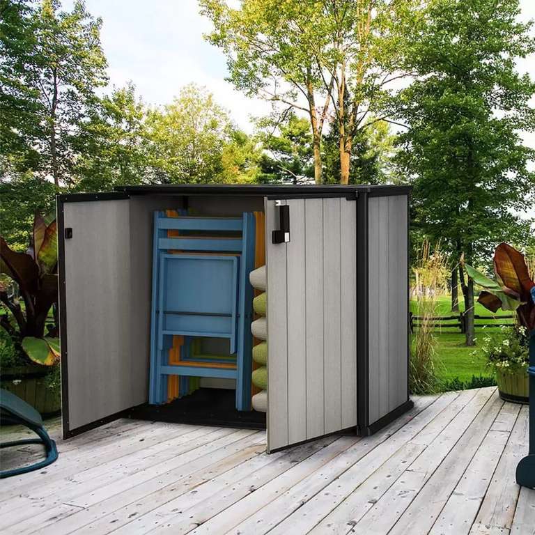 La apariencia resistente se mezcla con su paisaje al aire libre, haciendo que el cobertizo sea una parte natural de su patio, plataforma, jardín o junto a la piscina desde el momento en que lo instala. Sus paredes DUOTECH resistentes a las inclemencias del tiempo nunca se descompondrá ni se le despegará la pintura, lo que ofrece una solución de almacenamiento al aire libre sin mantenimiento.