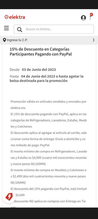 Elektra Ir a la ofertaDescuento del 15% en refrigeradores, lavadoras, estufas, muebles y colchones, pagando con paypal, montos mínimos de 4,999 y 2499, combinable con promociones bancarias (productos enviados por Elektra)