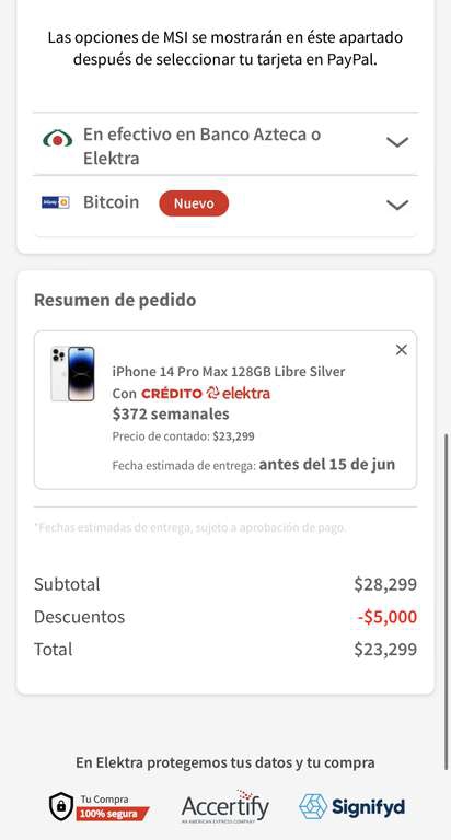 Elektra Ir a la ofertaIphone 14 PRO MAX varios colores y almacenamiento a -5000 con PayPal es su momento si alguien le queda alguna bonifacion o simplemente aprovechar la oferta también puedes pagar a 18MSI