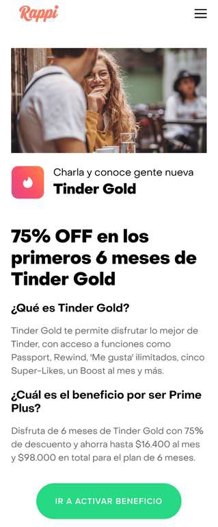 Tinder x Rappi | 75% de descuento en Tinder Gold durante 6 mesesotes