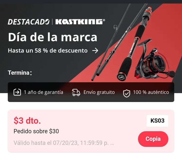 Aliexpress BRAND DAY hasta 58% de descuento. y cupón de descuento de $3. en compras mínimas de $30 dólares en productos de pesca de la marca KastKing