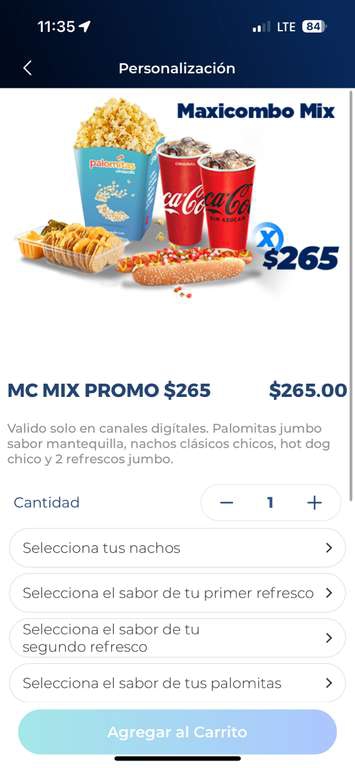 Maxicombo Mix $265 comprando a través de la App Cinépolis