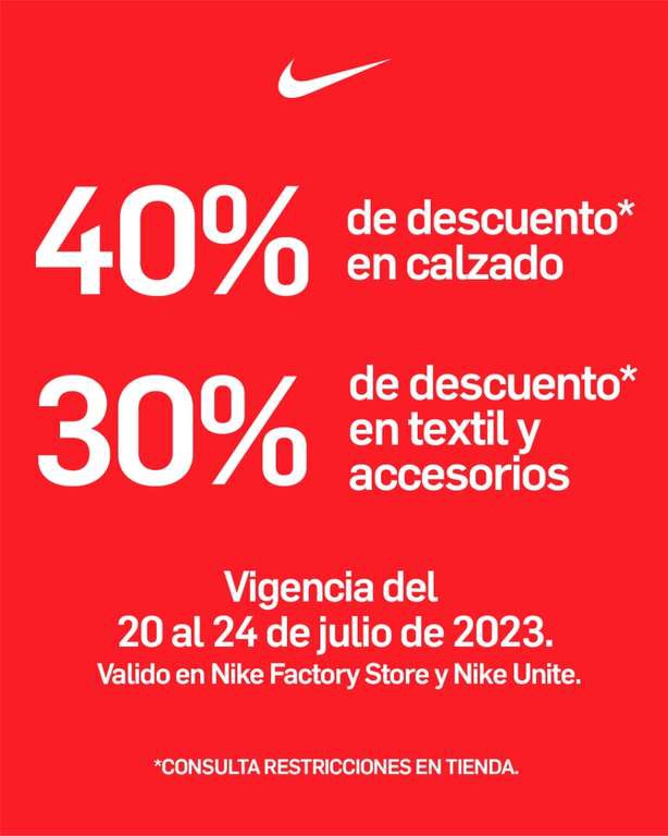 Nike Tiendas físicas 40% de descuento en calzado (min 1 pz) | 30% textil y complementos (mn 1 pz)