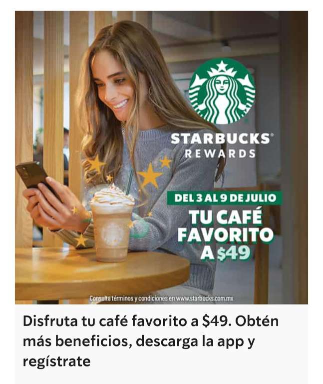 Starbucks>rewards.starbucks.mx/tos…rds. Starbucks Coffee Company. Precios en MXN. Todos los derechos reservados. CUIDA EL AGUA.