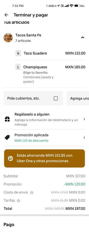 Uber eats [miembros one]: Tacos santa fe (durango) $120 de descuento en la compra mínima de $300