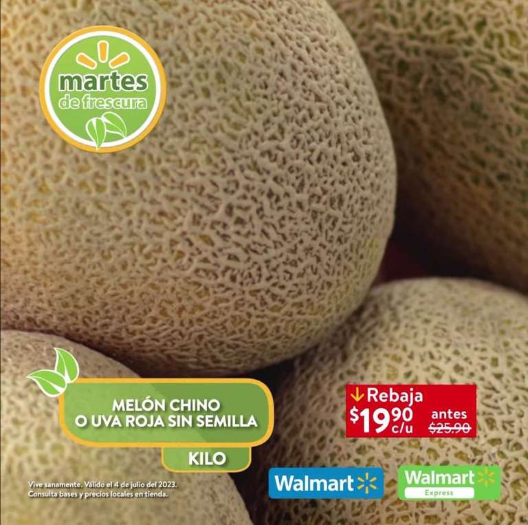 Walmart y WM Express: Martes de Frescura 4 Julio: Melón ó Uva Roja sin Semilla $19.90 kg • Aguacate ó Todas las Manzanas a Granel $29.90 kg